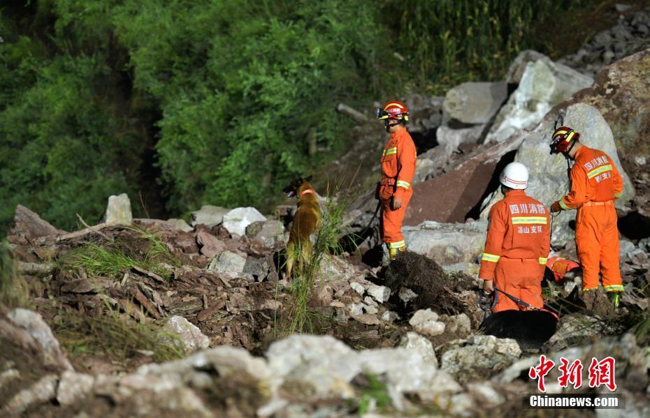 8月15日,四川甘洛,成昆铁路埃岱站区间附近发生的山体垮塌现场,失联人员搜救工作紧张进行。图为消防救援人员、搜救犬在现场搜寻。中新社记者刘忠俊 摄