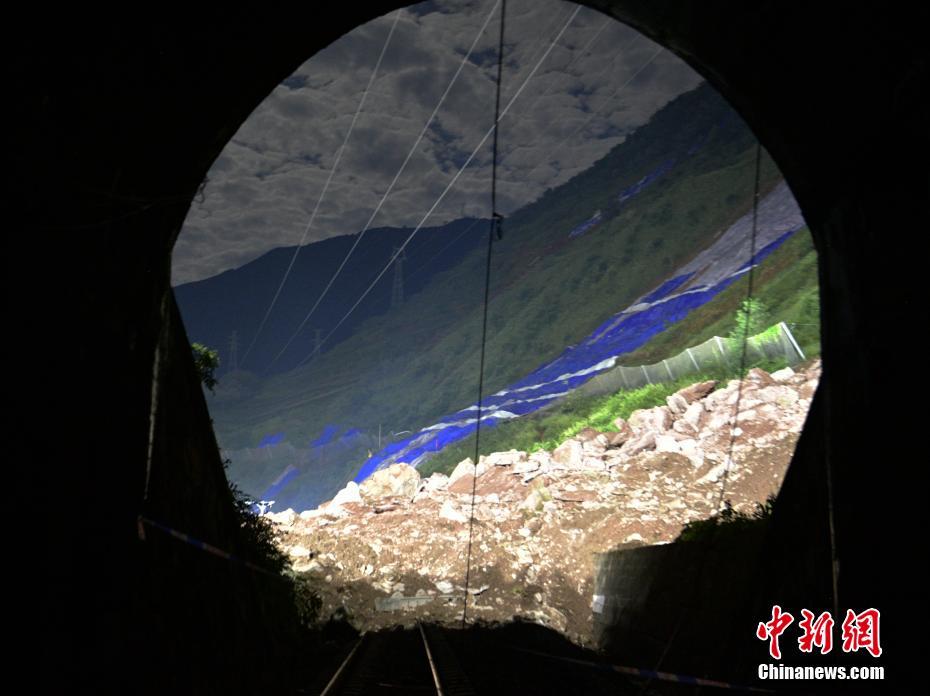 8月15日,四川甘洛,成昆铁路埃岱站区间附近发生的山体垮塌现场,失联人员搜救工作紧张进行。图为成昆铁路埃岱隧道进口已被泥石封堵住。中新社记者刘忠俊 摄