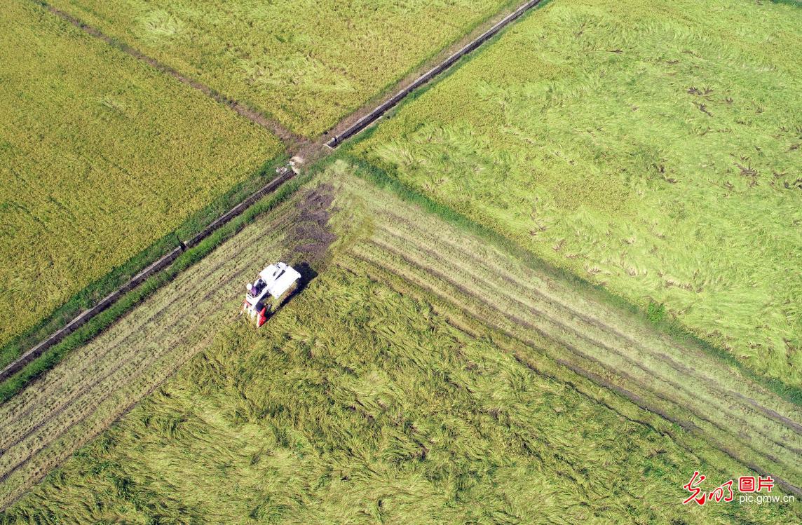 2019年8月14日,江苏常州金坛区黄金村的村民在收割有机早稻。立秋过后,当地种植的170余亩早稻进入成熟收获季,村民们抓住连日的晴好天气开镰收割,颗粒归仓。(陈暐摄/光明图片)