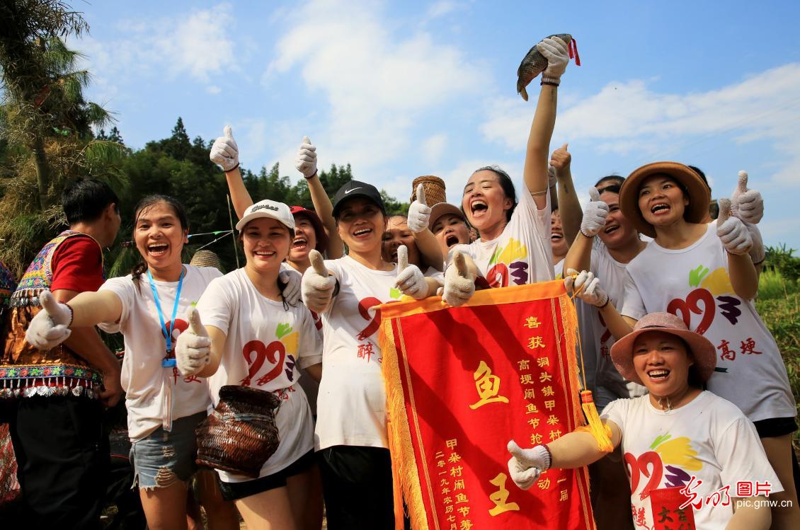 2019年8月14日,争抢到"鱼王"的村民合影留念。当日,广西柳州市融水苗族自治县洞头镇甲朵村举行传统闹鱼节,村民将500多公斤活鱼在村边小河中陆续抛出,一条条活鱼如同"飞鱼"一般"从天而降",村民和游人争抢抓这些象征福气的"飞鱼",庆祝丰收。(龙涛摄/光明图片)
