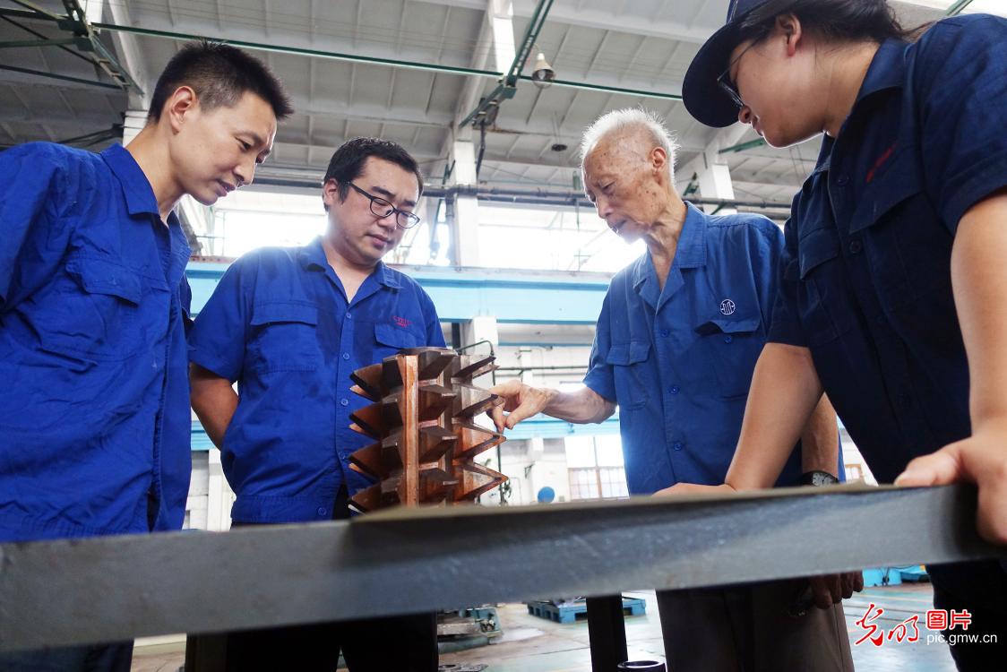 2005年至今,近15年如一日,张邦栋不计工资报酬,仍然坚守岗位,痴迷刀具研究,如今仍是车间的"活字典"。图为张邦栋(右二)在车间同技术员及工人,讨论刀具加工难题。(黄政伟摄/光明图片)