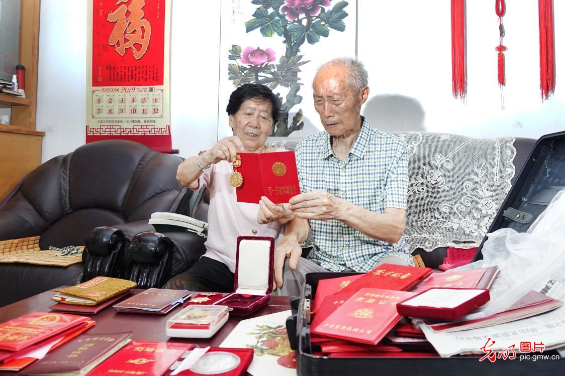 退休近25年来,他还在为研制国家需要的大型伞齿轮奉献着余热。一批像张邦栋一样,痴心企业、痴迷事业的技术人员,不断撑起着共和国的"装备脊梁"。图为张邦栋(右)展示几十年来获得的各种荣誉。(黄政伟摄/光明图片)