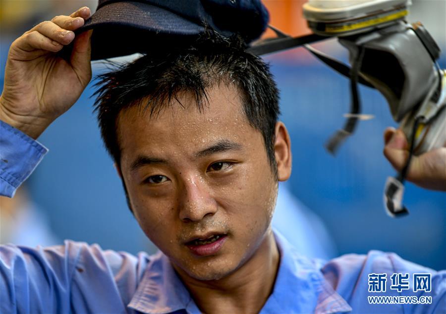 8月14日,清理工作结束后,浑身大汗的电枢清理工唐建摘下自己的工作防护装备。新华社记者 刘潺 摄