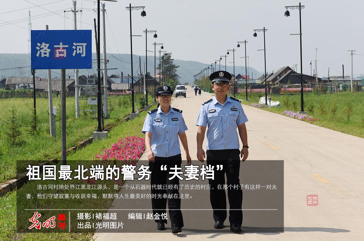 洛古河村地处界江黑龙江源头,是一个从石器时代就已经有了历史的村庄,在那个村子有这样一对夫妻,他们守望寂寞与收获幸福,默默将人生最美好的时光奉献在这里。图为2019年8月5日,在黑龙江省漠河市洛古河村,民警贾晨翔和妻子王晓莲共同进辖区开展工作。(褚福超摄/光明图片)