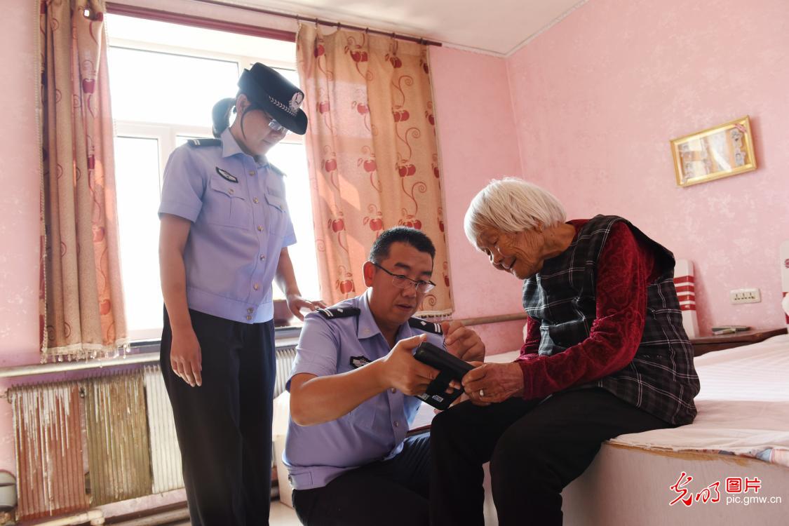 今年已经是贾晨翔和妻子王晓莲在洛古河村驻守的第十个年头。十年的时间里,“工作就是生活、警务就是家务”,他们把“家务”打理得井井有条,把“生活”过得有滋有味,他们将自己的家扎根在了洛古河。图为2019年8月5日,在黑龙江省漠河市洛古河村,民警贾晨翔和妻子王晓莲为92岁高龄的老人采集指纹信息,上门办理身份证。(褚福超摄/光明图片)