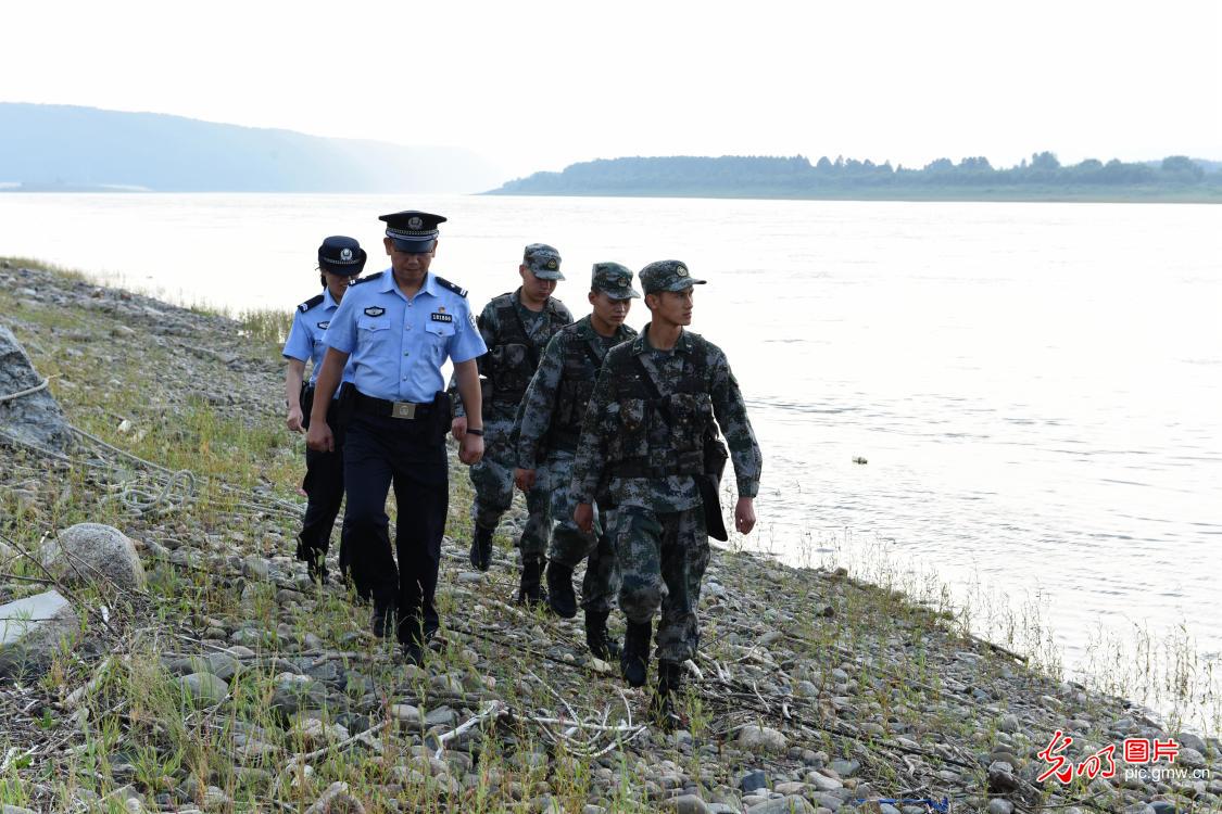 对于贾晨翔一家来说,幸福是简单的,是实实在在的,是看得见摸得着的。有王晓莲和小北北在,就有幸福,能帮助群众解决一个又一个难题就是幸福,不用太多的语言,一切安好,就是幸福。图为2019年8月5日,在黑龙江省漠河市洛古河村,民警贾晨翔和妻子王晓莲与驻地边防连队共同进行边境踏查。(褚福超摄/光明图片)