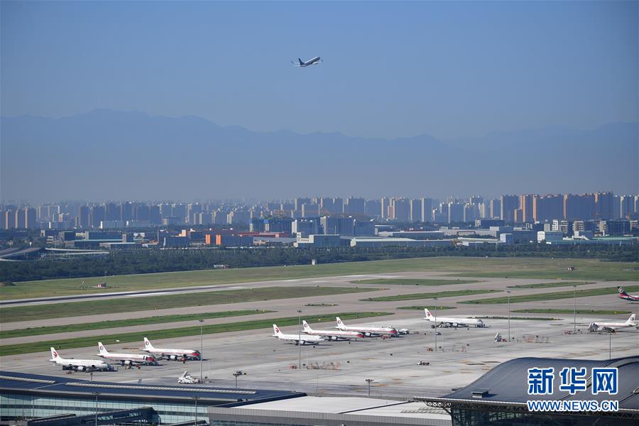 8月15日,一架飞机从西安咸阳国际机场起飞离港。新华社记者 邵瑞 摄