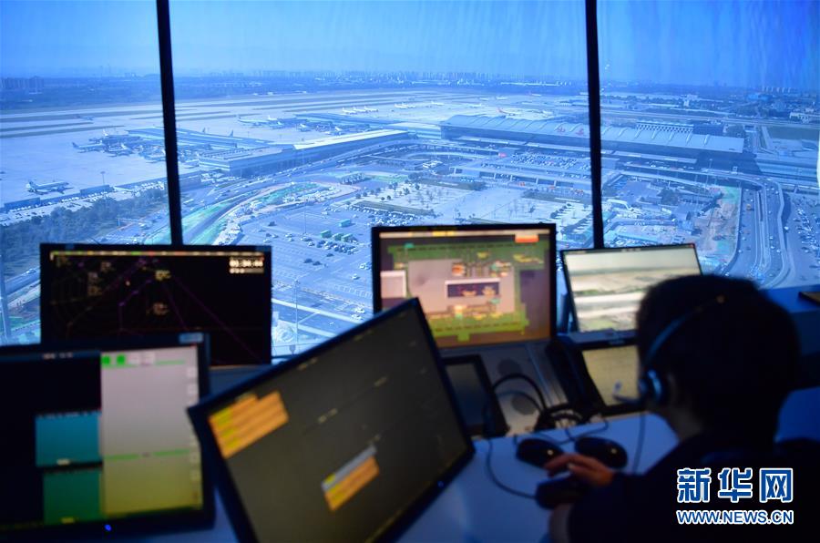 8月15日,空管员在西安咸阳国际机场塔台管制室监控航班运行情况。新华社记者 邵瑞 摄