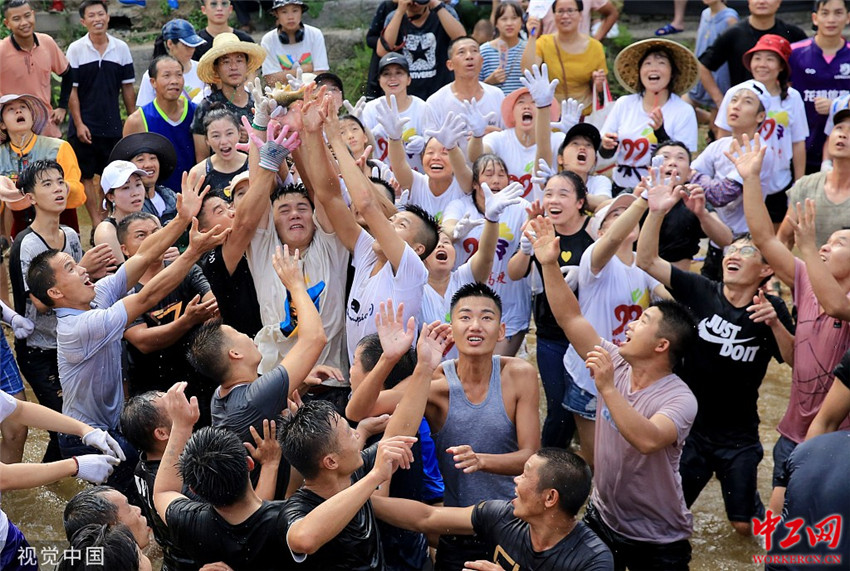 2019年8月14日,广西柳州市融水苗族自治县洞头镇甲朵村,村民和游人争抢从天而降的“飞鱼”。