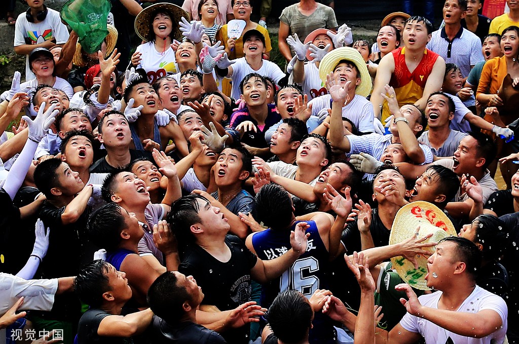 2019年8月14日,广西柳州市融水苗族自治县洞头镇甲朵村,村民和游人争抢从天而降的“飞鱼”。