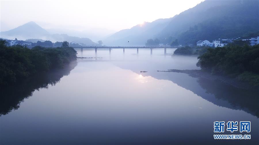 8月15日无人机拍摄的桃花潭风景区一景。 当日清晨,位于安徽省宣城市泾县的桃花潭风景区晨雾缭绕,美如画卷。 新华社记者 张端 摄