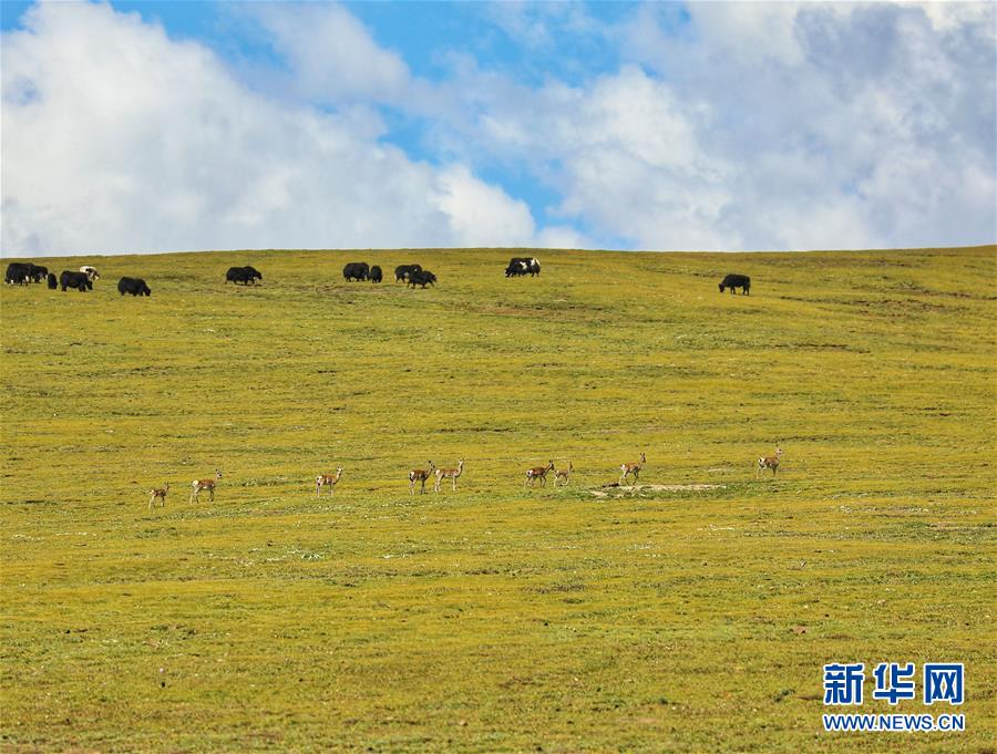 一群藏原羚在牦牛群旁驻足吃草(8月14日摄)。 8月12日至14日,来自全国各地的31名自然爱好者聚集在海拔4200米的青海省玉树藏族自治州称多县嘉塘草原,参加“2019嘉塘自然观察节”。自然爱好者用独特视角记录珍稀野生动植物,观察三江源生态。 新华社记者 田文杰 摄