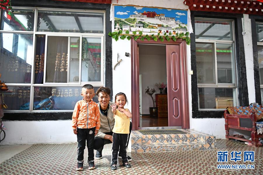 村民多吉久美(中)和6岁的儿子甘旦多吉(左)、4岁的女儿扎西措姆在自家留影。新华社记者 李鑫 摄