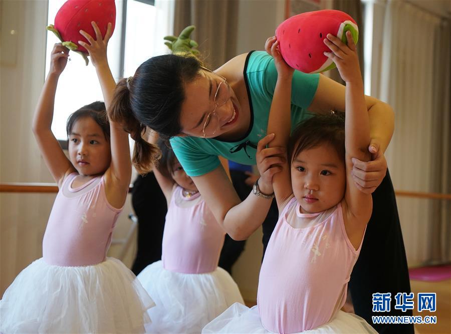 在宿迁市洋河新区新城名苑社区活动中心,小朋友们在老师的指导下练习舞蹈动作(7月15日摄)。 新华社记者 季春鹏 摄