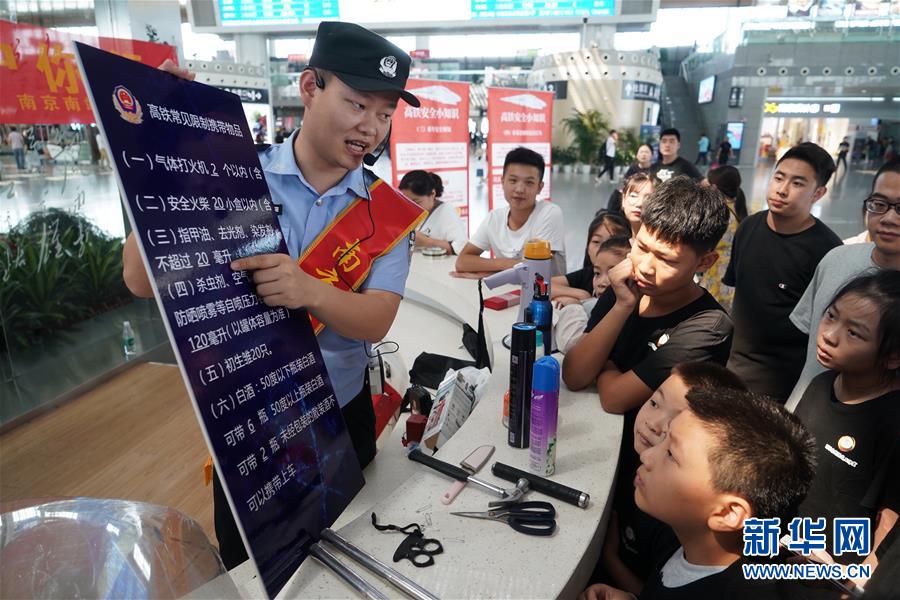 8月16日,在南京南站候车大厅,民警在介绍乘坐高铁限制携带物品。 当日,南京铁路公安处南京南站派出所民警组织开展“平安站车路,金盾护你行”活动。民警们在候车大厅宣讲暑运旅途安全注意事项、乘坐高铁防盗防骗技巧等,并给小朋友们发放防暑中药香囊、驱蚊手环,帮助旅客们安全舒适出行。 新华社记者 季春鹏 摄