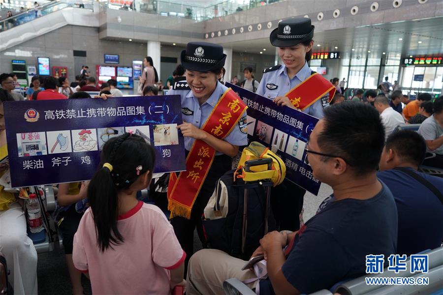 8月16日,在南京南站候车大厅,民警在介绍高铁禁止携带物品。 当日,南京铁路公安处南京南站派出所民警组织开展“平安站车路,金盾护你行”活动。民警们在候车大厅宣讲暑运旅途安全注意事项、乘坐高铁防盗防骗技巧等,并给小朋友们发放防暑中药香囊、驱蚊手环,帮助旅客们安全舒适出行。 新华社记者 季春鹏 摄
