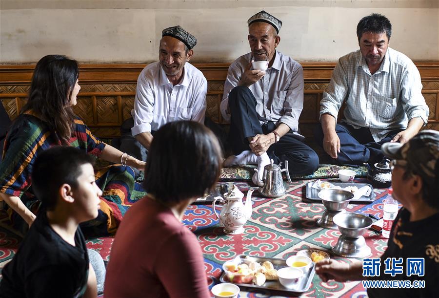 在新疆喀什古城景区内的百年老茶馆里,游客和当地居民一起喝茶聊天(8月13日摄)。 眼下正值新疆旅游旺季,来喀什游玩的游客络绎不绝。从新疆喀什市文化体育广播电视和旅游局了解到,今年1月至7月,前往喀什市旅游的游客达450万人次,同比增长近60%。 新华社记者 王菲 摄