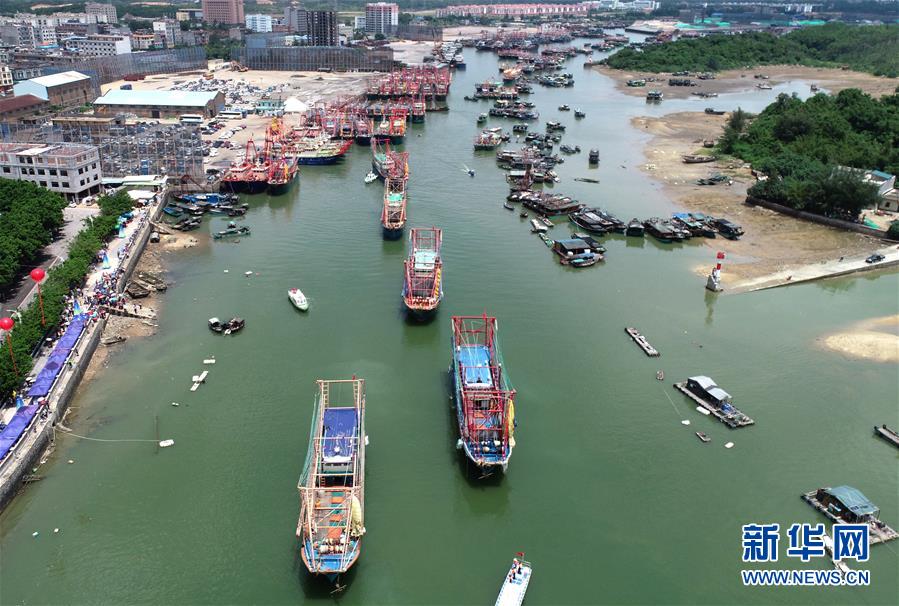 8月16日,渔船从广西防城港市港口区企沙港陆续拔锚启航(无人机拍摄)。 新华社记者 周华 摄