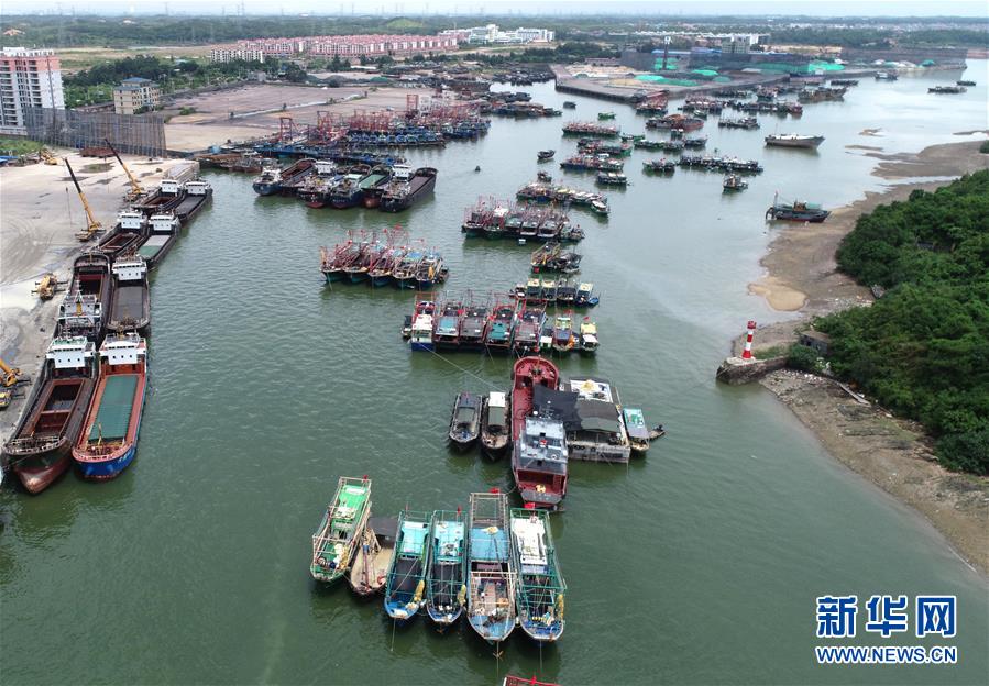 8月16日,渔船从广西防城港市港口区企沙港陆续拔锚启航(无人机拍摄)。 新华社记者 周华 摄