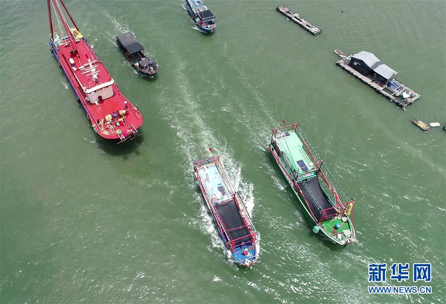 8月16日,渔船从广西防城港市港口区企沙港陆续拔锚启航(无人机拍摄)。 新华社记者 周华 摄