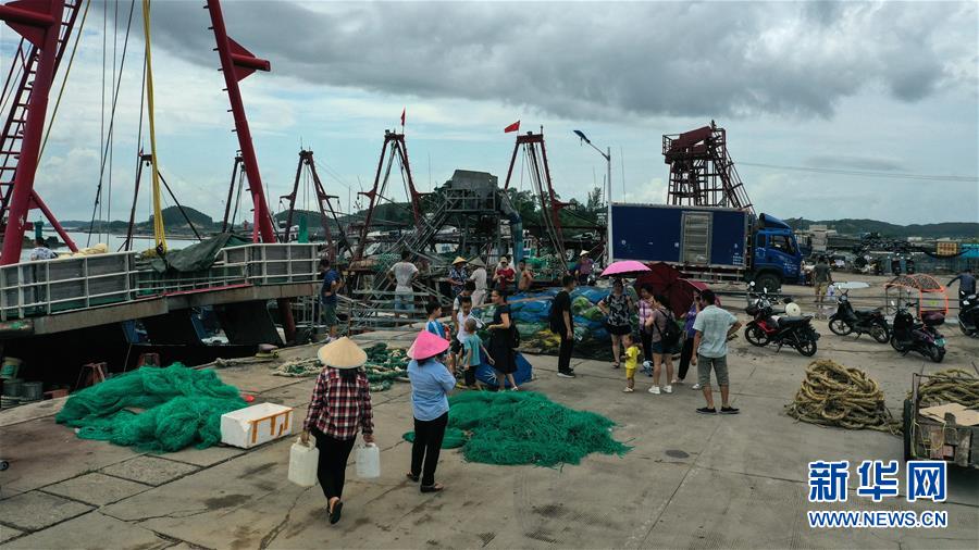 8月16日,在广西钦州市龙门港,渔民向捕鱼船上装运补给品(无人机拍摄)。 新华社记者 张爱林 摄