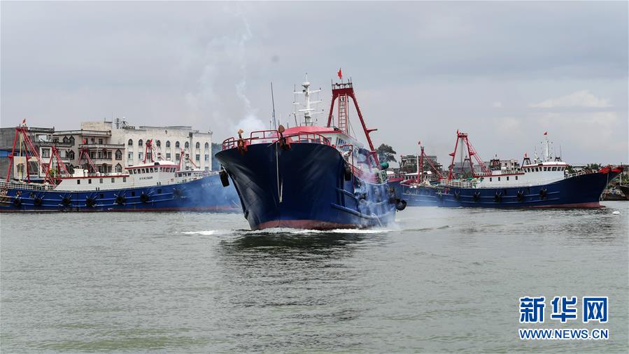 8月16日,在广西钦州市龙门港,渔民按照传统习俗鸣放礼炮出海作业。 新华社记者 张爱林 摄