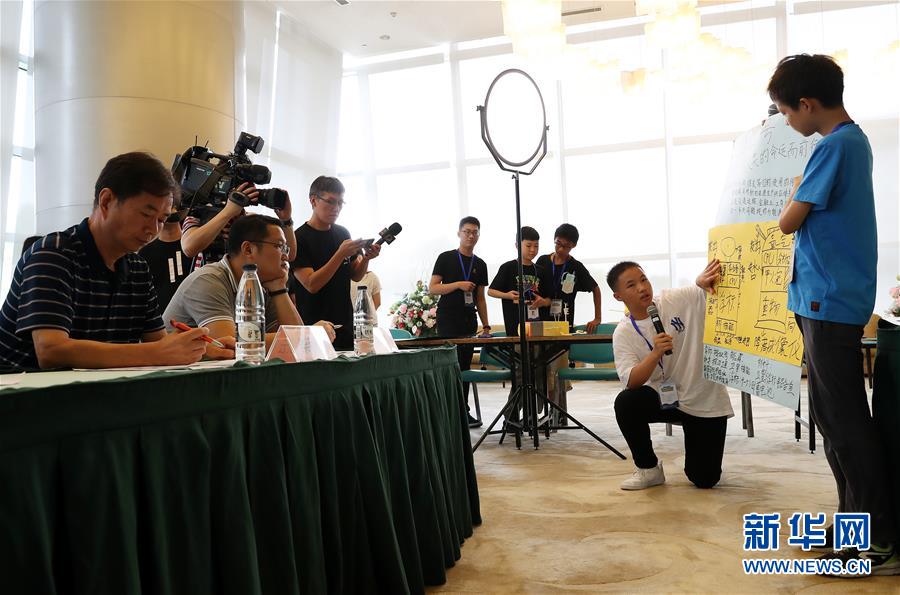 8月16日,来自上海市侨光中学的卞元俊(右二)在汇报会上通过展板向评委老师介绍他所在团队设计的“提坦号”土卫二能源探测卫星的设计思路。 当日,上海科技馆举行2019年“青少年科学创新实践工作站”汇报总结会。工作站通过上海市教委招募在读初中生40人,在结对导师的指导下分组开展“地球卫士”、“走近人工智能的世界”和“小小工匠养成记”三项创新实践微课题研究。同学们在汇报总结会上展示各自的科创实践成果,表达自己对科技改变生活的创想。 新华社记者 方喆 摄