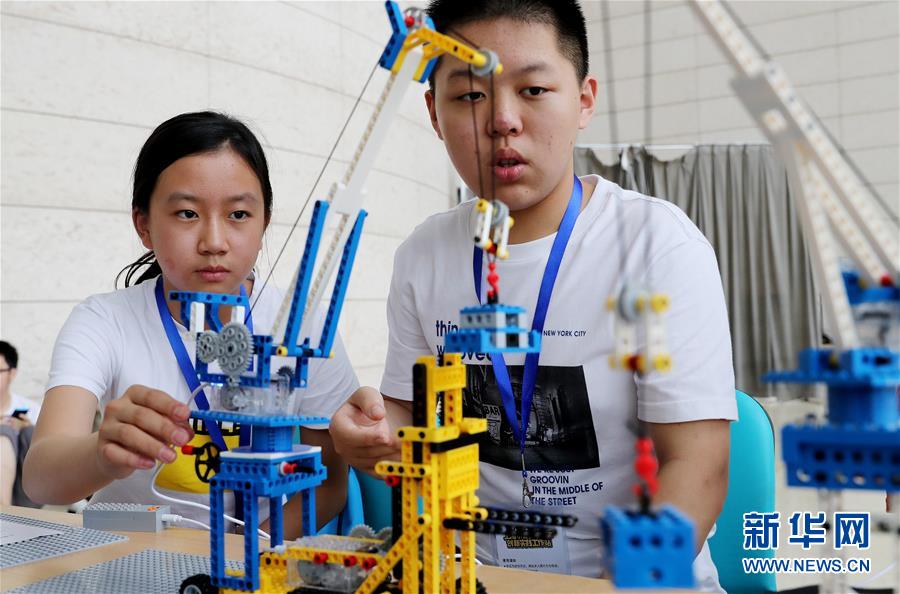 8月16日,来自上海沪新中学的丁煜祺(左)和汤本洵在调试共同制作的“起重机”。 当日,上海科技馆举行2019年“青少年科学创新实践工作站”汇报总结会。工作站通过上海市教委招募在读初中生40人,在结对导师的指导下分组开展“地球卫士”、“走近人工智能的世界”和“小小工匠养成记”三项创新实践微课题研究。同学们在汇报总结会上展示各自的科创实践成果,表达自己对科技改变生活的创想。 新华社记者 方喆 摄