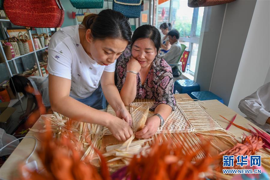 8月13日,在长春市翠羽农民专业合作社,张红梅(前左)指导社员用玉米叶制作工艺品。 新华社记者 张楠 摄
