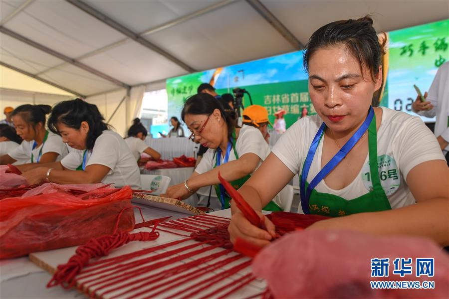 8月16日,在吉林省暨长春市“吉林巧姐”草编大赛现场,张红梅(右一)在制作比赛作品。 新华社记者 张楠 摄