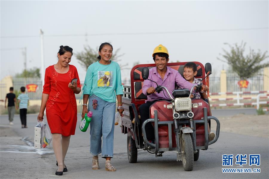 8月15日,在泽普县桐安乡,居民热娜古丽·喀尔曼(左)一家购物后走在回家的路上。 新华社记者 丁磊 摄