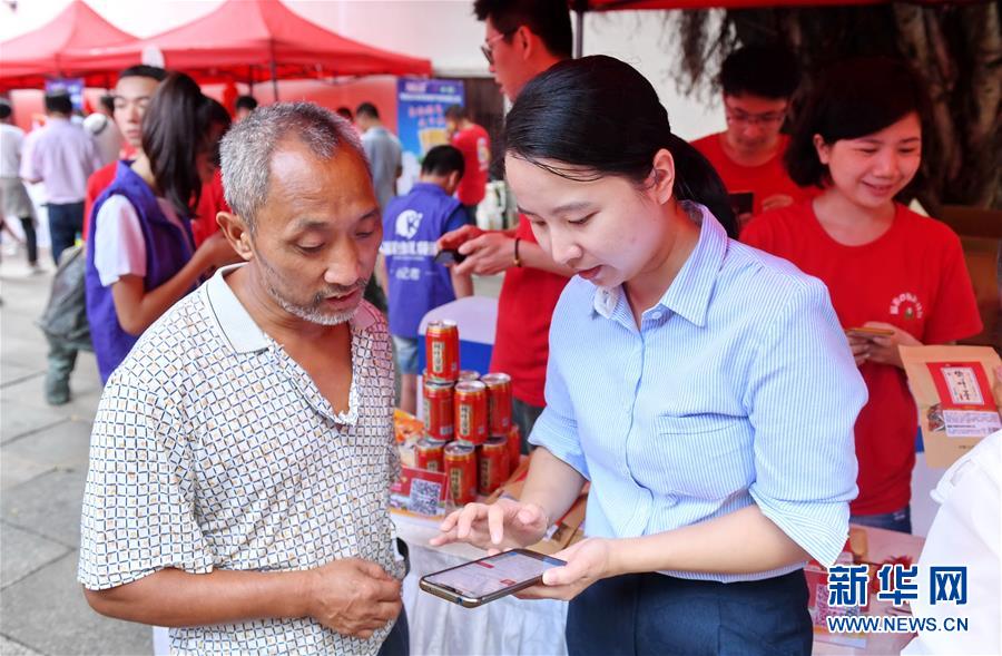 8月16日,福建省农村信用社联合社工作人员郑煌霞(右)在“福农e购赶圩节”启动现场教顾客进行线上下单线下提货的购物流程。 当日,由福建省农村信用社联合社自建的公益性电商平台“福农e购赶圩节”启动仪式暨“为荷而来”乡味建宁推介会在福州启动。“福农e购赶圩节”开启互联网“赶圩”平台,让城乡居民能随时在线上“圩市”购买到地道的农村土特产。 新华社记者 林善传 摄