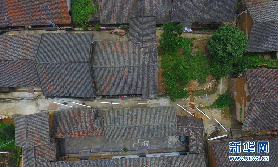 龙革雄和村民一起搬运雨污分流工程水管(2017年8月18日无人机拍摄)。新华社记者 黄孝邦 摄