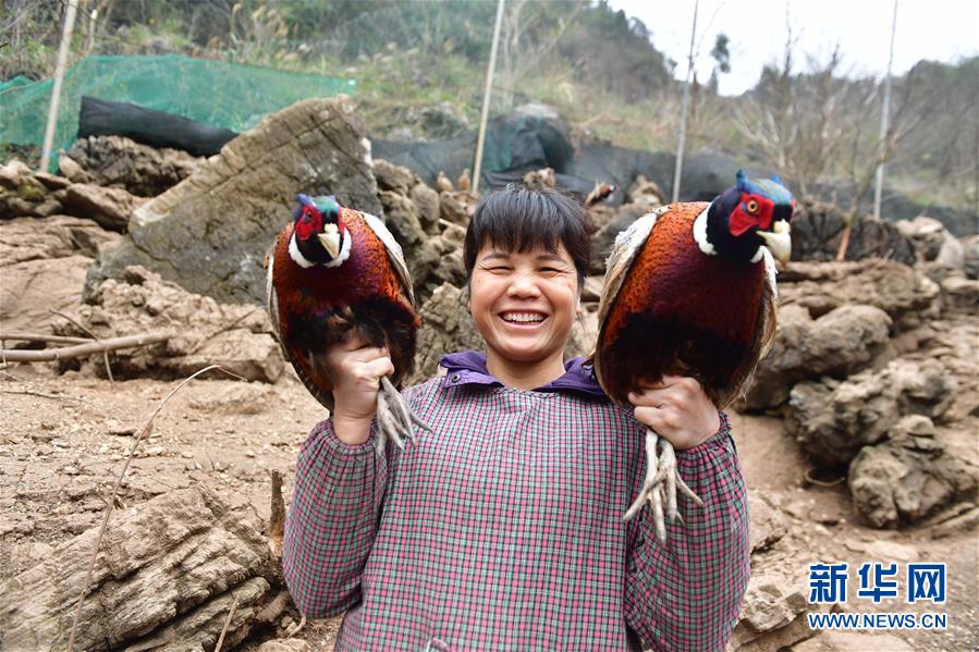 龙革雄的妻子罗桂枝在展示养殖的山鸡(2月4日摄)。 新华社记者 黄孝邦 摄