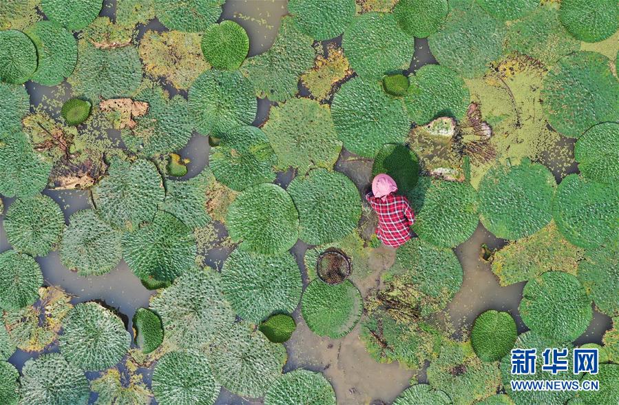 8月16日,东起乡良村村芡实种植户在采收芡实(无人机拍摄)。