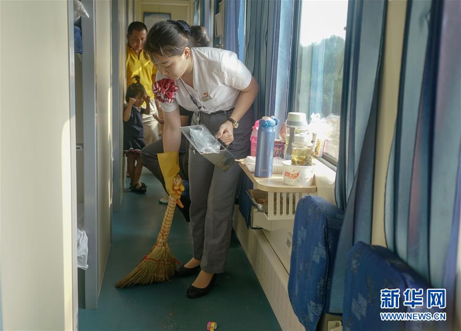 8月16日,在福州开往北京的Z60次列车上,乘务员在打扫卫生。新华社记者 宋为伟 摄