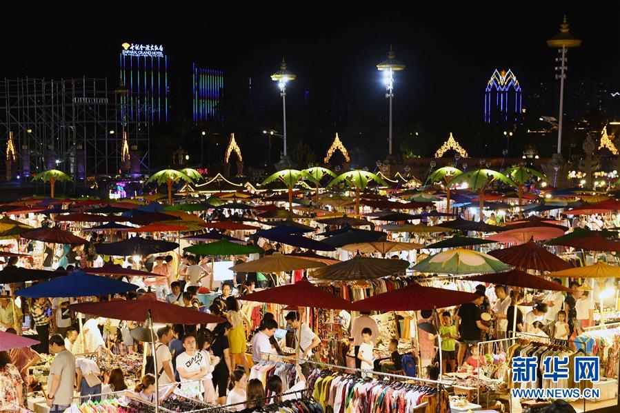 8月16日,在西双版纳傣族自治州景洪市,游客在澜沧江畔的夜市休闲购物。新华社记者 杨宗友 摄