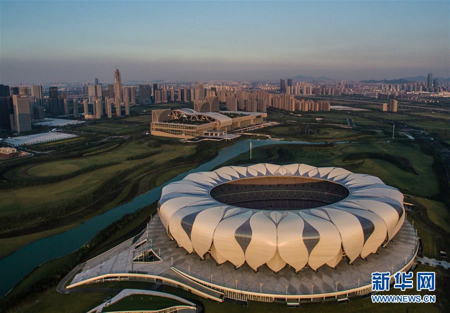 这是钱塘江畔的杭州奥体中心与杭州国际博览中心(2016年8月25日无人机拍摄)。新华社记者 黄宗治 摄