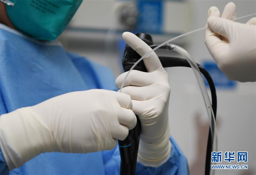肖阳宝在湖南省胸科医院内镜中心诊室内为患者进行内镜检查(8月14日摄)。 新华社记者 薛宇舸 摄