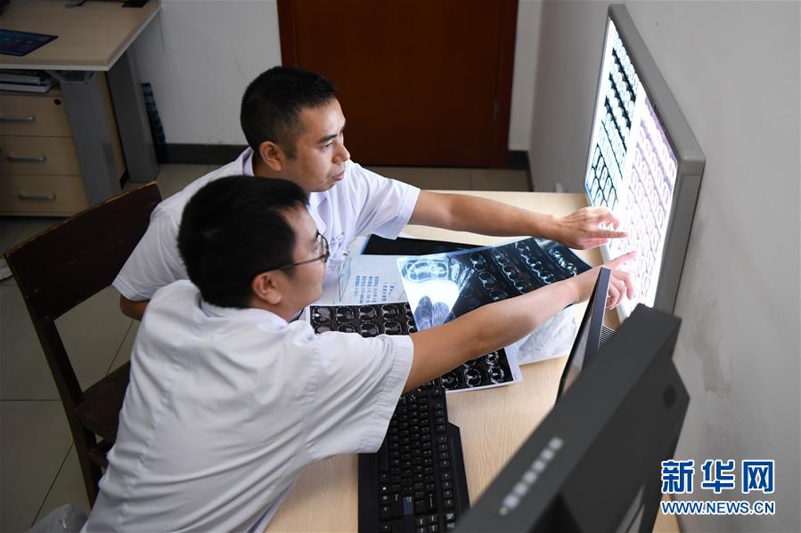 肖阳宝(上)在湖南省胸科医院内镜中心和放射科医生一起阅片(8月15日摄)。 新华社记者 薛宇舸 摄