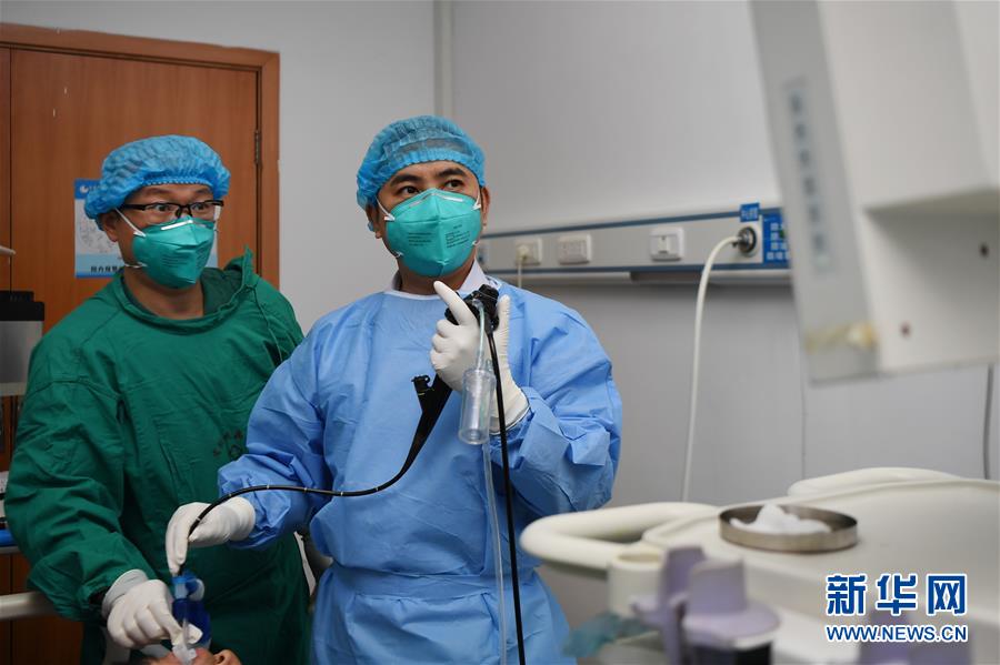 肖阳宝(右)在内镜中心诊室内为患者进行内镜检查(8月14日摄)。 新华社记者 薛宇舸 摄