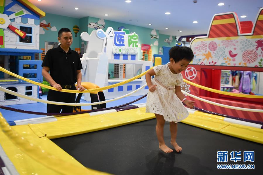 肖阳宝带女儿在游乐场玩蹦床(8月17日摄)。 新华社记者 薛宇舸 摄