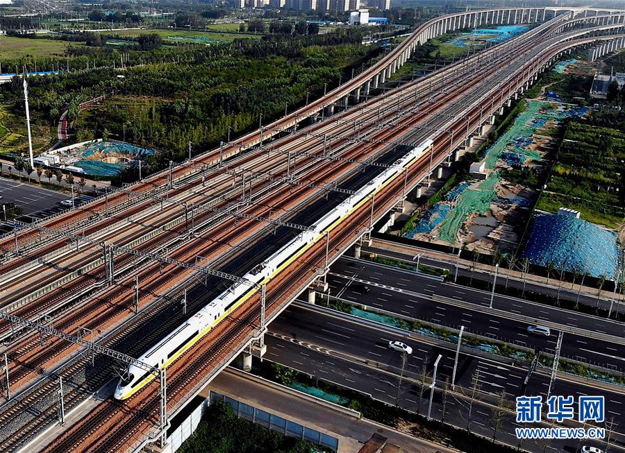 8月18日,高速综合检测列车行驶在郑州东站附近的线路上(无人机拍摄)。 当日,郑(州)阜(阳)铁路郑州南至界首南区间开始联调联试,标志着河南“米”字形高速铁路网的“一捺”进入开通运营倒计时。郑阜铁路河南境内正线长度为211.764公里,速度目标值为每小时350公里。 新华社记者 李安 摄