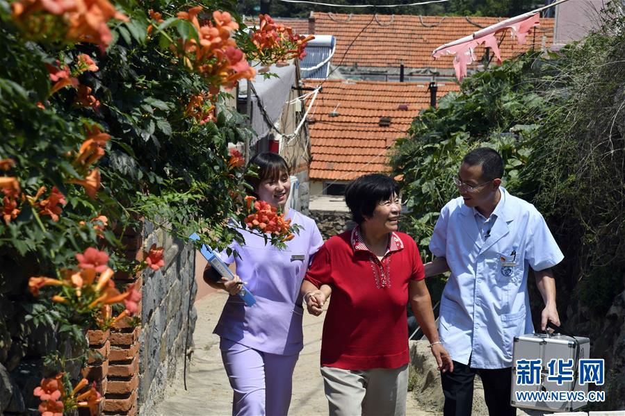 8月16日,在青岛市西海岸新区灵山岛,周兆敬(右)入户为病人巡诊。 新华社记者 王凯 摄
