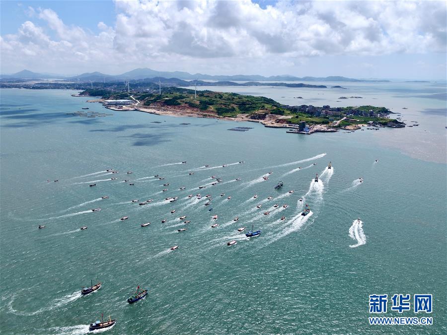 在2019年首届福清开渔节暨海洋文化旅游节上,渔船在海上行驶(8月3日无人机拍摄)。 新华社记者 姜克红 摄