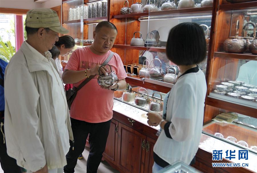 游客在李德昌家开设的乡村旅游店里挑选银器制品(8月10日摄)。 新华社记者 秦晴 摄
