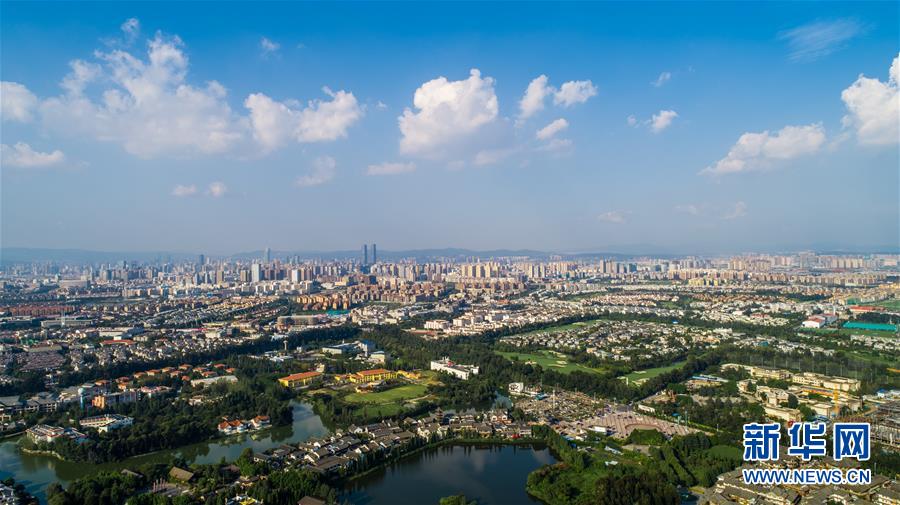 这是在云南民族村拍摄的美景与城市风光(8月15日无人机拍摄)。 昆明地处云南中部,是全省政治、经济、文化、教育、科研、社会事业发展中心和交通、通讯枢纽。由于温度、湿度适宜,日照长,霜期短,所以鲜花常年不谢,草木四季常青。 新华社记者 胡超 摄