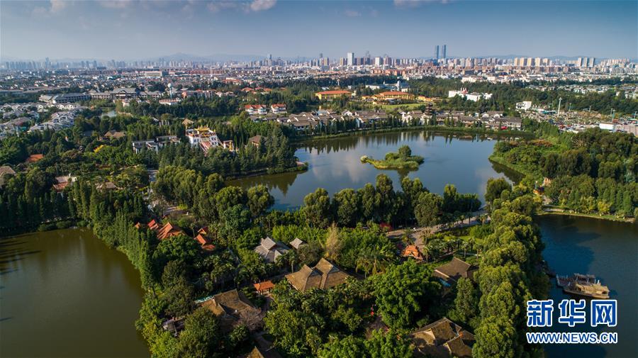 这是在云南民族村拍摄的美景与城市风光(8月15日无人机拍摄)。 昆明地处云南中部,是全省政治、经济、文化、教育、科研、社会事业发展中心和交通、通讯枢纽。由于温度、湿度适宜,日照长,霜期短,所以鲜花常年不谢,草木四季常青。 新华社记者 胡超 摄