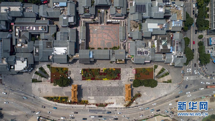 空中俯瞰昆明市中心的金马碧鸡坊(8月16日无人机拍摄)。 昆明地处云南中部,是全省政治、经济、文化、教育、科研、社会事业发展中心和交通、通讯枢纽。由于温度、湿度适宜,日照长,霜期短,所以鲜花常年不谢,草木四季常青。 新华社记者 江文耀 摄