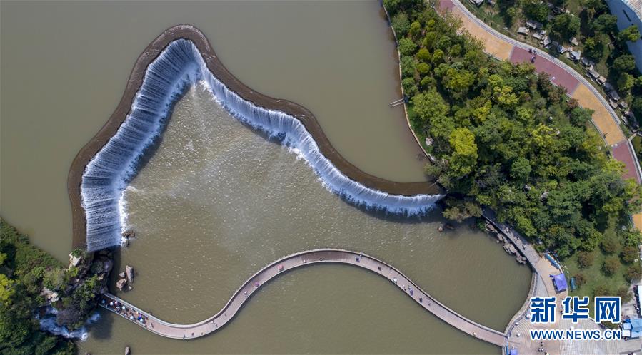 游客徜徉在昆明瀑布公园的步行道上(8月17日无人机拍摄)。 昆明地处云南中部,是全省政治、经济、文化、教育、科研、社会事业发展中心和交通、通讯枢纽。由于温度、湿度适宜,日照长,霜期短,所以鲜花常年不谢,草木四季常青。 新华社记者 江文耀 摄